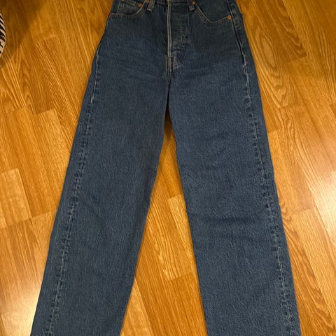 Levi's Ribcage Straight Ankle jeans for dame i størrelse XS med livvidde W23. Buksen er laget i blå denim. Modellen har høyt liv, rette ben og ankellengde. Klassisk femlommersdesign med glidelås og knapp i front samt beltehemper i linningen. Passer til hverdagsbruk og kan kombineres med ulike topper og sko.