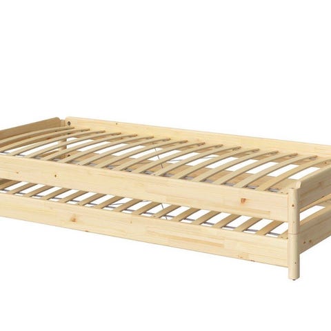 En fin lav enkeltseng i furu med madrassmål 80 x 200 cm selges med ribbebunn men uten madrass. Dette er én av to helt like senger fra Ikea, fra produktet UTÅKER stableseng.
