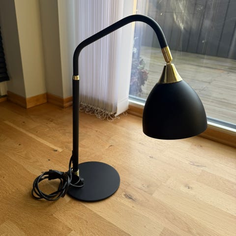 Stilig skrivebordslampe i sort og messing