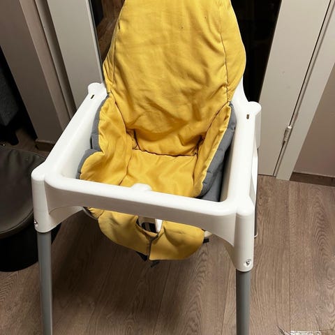 Selger pent brukt Antilop barnestol med bordplate som kan tas av og to ulike trekk. Det røde trekket har en oppblåsbar pute med som gjør at man får bedre støtte til de minste barna. Det gule trekket er tynt polstret for mykere sete. Kan også brukes uten trekk.