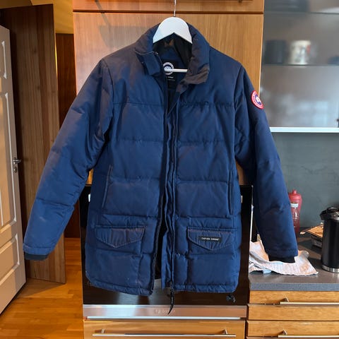 Canada Goose dunjakke for dame i størrelse M. Jakken er oliven/militær-grønn og fylt med dun, noe som gir god isolasjon. Modellen har hette med pelskant i ulveskinn, høy krage og lengre passform som dekker godt nedover lårene. Ytterjakken har flere lommer foran og justering i livet bak for bedre passform. Passer som varm ytterjakke i kaldt vær.