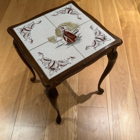 Dansk nestebordsett trebord med keramiske fliser motiv seilskip. Settet består av tre bord i heltre/finér med rektangulær bordplate. Platene er innfelt med lyse keramiske fliser dekorert med brune motiver av seilskip og kystlandskap i hver flis. Understell i tre med rette ben og avstivere mellom bena. Bordene er laget i Danmark, merket «Made in Denmark» under. Egner seg som sidebord eller småbord i stue eller oppholdsrom, og kan skyves inn under hverandre for plassbesparende oppbevaring. FANTASTISK FINT LITE TEAKBORD MED HÅNDMALT KERAMISKE FLISE