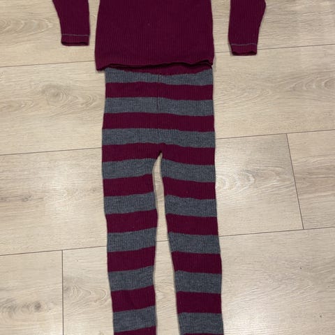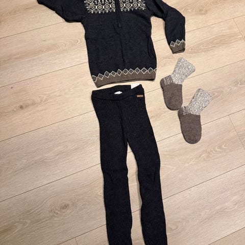 Fint, tykt ullsett. Passer godt som mellomlag. Et hull nederst på det ene beinet, som lett kan syes.