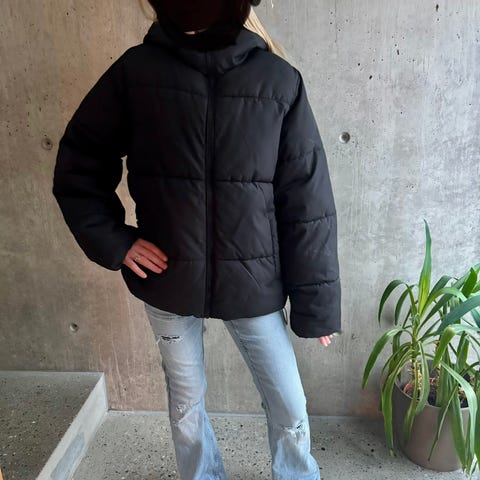 Selger en sort glossy pufferjakke fra Crās i størrelse 34.