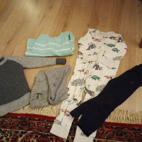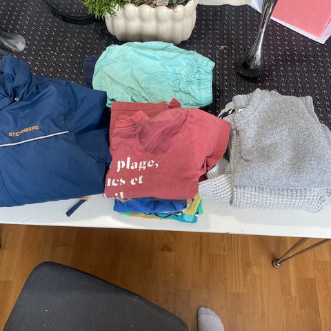 Gir bort tre gensere, tre t-skjorter og seks bukser. Det meste er str 92, noe er str 98. Klærne er godt brukt, noen har små flekker eller hull, men supre til barnehagen. Må hentes ved Kampen park