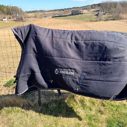 Meget pent og lite brukt Kingsland stalldekken på ca 300-400 gram med bogsplitter og haleflapp str. 135/6`3. Komplett med mage- og benstropper. Ikke vasket så lukter litt hest. Knapt noen bruksmerker - se bilde.
