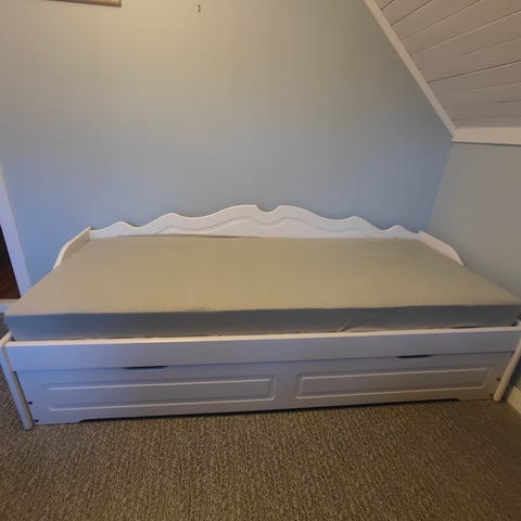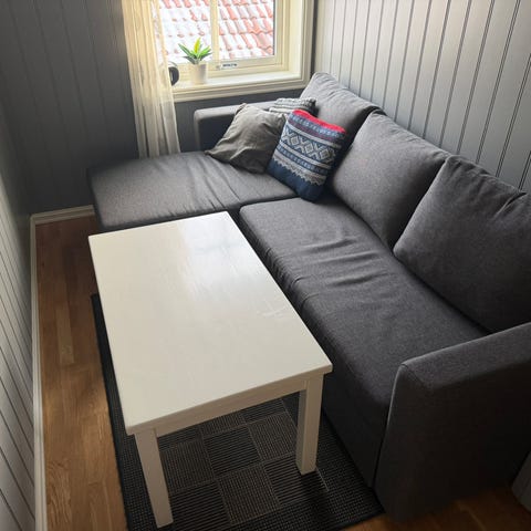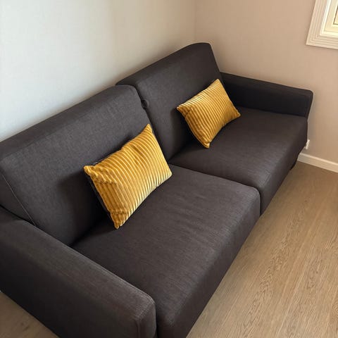 Der ene armlenet (nærmest veggen på bildet) har en skade, og kan med fordel fikses. Men den fungerer uansett fint både til sitting og soving.