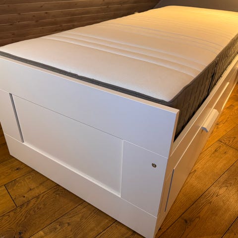 Se produktside på IKEA for mer informasjon: https://www.ikea.com/no/no/p/brimnes-hodegavl-med-rom-hvit-60228712/