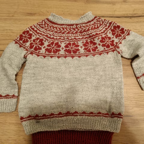 Strikket genser i mykt merinoull. Passer til barn fra 1-2 år. Bredden på bolen er 29 cm, armen er 14 cm lang. Høyden/lengden på genseren er 33 til 34 cm.