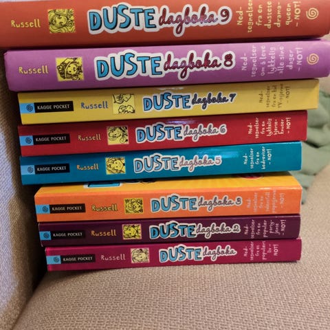 Dustedagboka av Rachel Renée Russel nr 1-8, 10, 12-14 på norsk selges for 50kr stk.