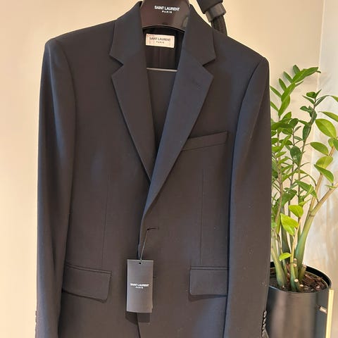 Saint Laurent blazer for herre i størrelse L. Blazeren er i grønn ull med rutemønster, i dempede oransje og gule farver. Klassisk enkelspent modell (3 knapper) med jakkeslag, frontlommer med klaff og brystlomme. Ermene har knapper nederst. Innsiden har glattsydd fôr med innerlommer. Egnet til bruk over skjorte eller genser til både formelle og mer uformelle anledninger.