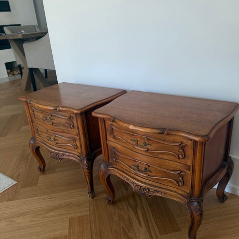 Dette er et par unike, sekskantede nattbord med rødfarge og gullfargede detaljer. Selges sammen med tilhørende sengegavl . Møblene er av tre og et ganske tunge og solide