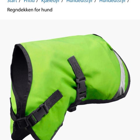 Regnfrakk: Lett regnfrakk til hund i grønn farge. Dekker rygg og bryst, med justerbare stropper for tilpasning rundt kroppen. Egnet for bruk i vått vær for å holde hunden tørr.