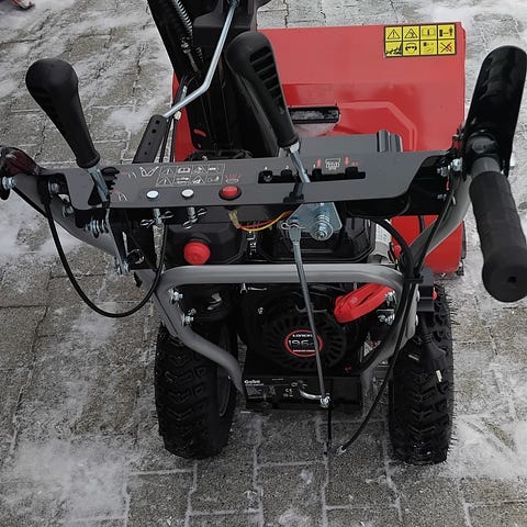 Modellen har tohjulsdrift med kraftige vinterdekk og regulerbart håndtak med betjeningshendler for drift og utkaster.