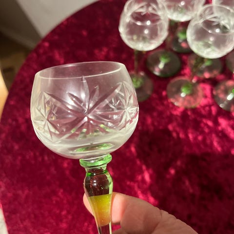 Nydelig dyp bringebærfarge / rubinfarge , slipte glass på stett, klar fot. Glassene har dekor med slipte mønstre i overflaten. Egner seg til servering av for eksempel dessertvin, likør eller andre drikker. Selges som sett slik det vises på bildene.