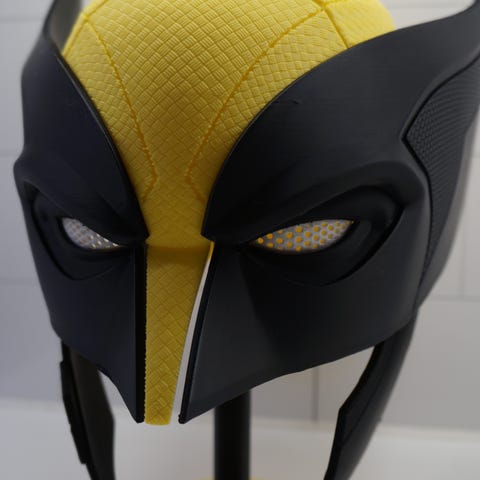 Selger en Deadpool-inspirert maske, 3D-printet. Deler er satt sammen med magneter og lim.