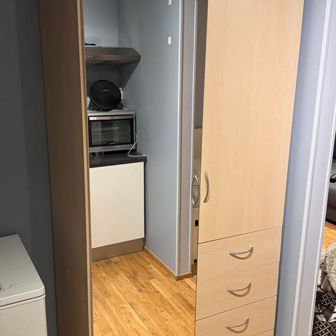 Et lite nett garderobeskap med speil, garderobestang, hyller og fire skuffer må nå videre. Trodde det var IKEA, men det har i så fall gått ut av produksjon. Målene er ca 80 cm bredt, ca 50 cm dypt og ca 200 cm høyt. Alle skuffene fungerer fint. Bakplaten har fått en skramme (se bildet). Må hentes av to personer, står i utebod på bakkeplan.