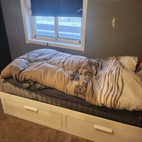 IKEA Brimnes dagseng med 2 skuffer. Kan dras ut til dobbeltseng. Veldig praktisk som gjesteseng. Skuffer virker som de skal, ingen skader. Lett å dra ut til dobbelt seng og dytte på plass igjen. Noen bruksmerker, se bilder. 2 madrasser kan følge med, noen bruksmerker på disse.