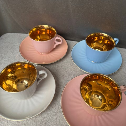Kopper og skål er i god stand. Liten fløtemugge har flere bruksmerker innvendig.