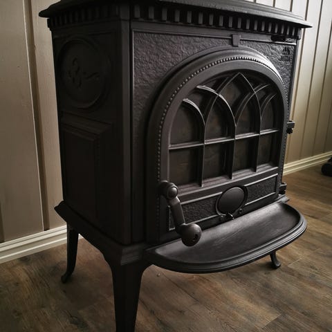 Jøtul 602 - GRØNN selges. Dette er ovn med kokeplate, og den kan enkelt kobles om fra bak- til topputtak.