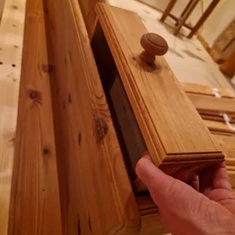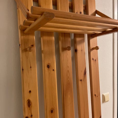 Trehylle til oppheng av kluter etc. limt et par steder, men vises ikke når den henger opp.