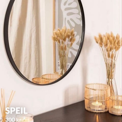 IKEA ovalt veggspeil med smal gullfarget ramme. Speilet har avrundede kanter og et minimalistisk uttrykk som passer i blant annet soverom, gang eller stue. Rammen er i metall med glatt overflate. Speilet monteres på vegg og kan brukes både som funksjonelt speil og som dekorativt innslag i interiøret.