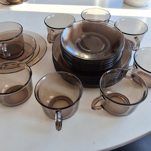 Fransk Arcoroc koppservise i sotet glass. 6 kopper med tefat/skåler. Ikke brukt