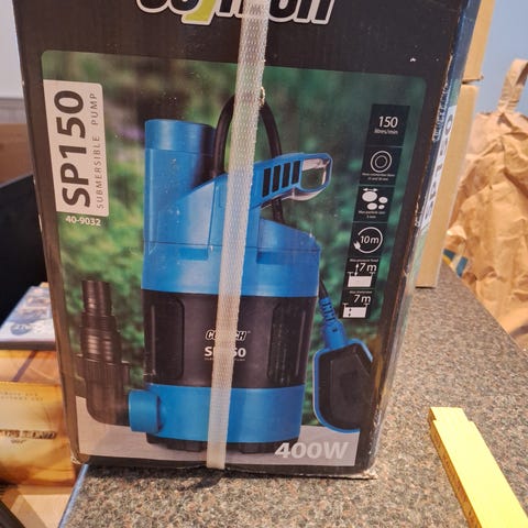 Europeisk-produsert Elpumps CT 3274 nedsenkbar pumpe. Flat Ø32 mm slange medfølger. Kapasiteten er oppgitt til 12 000 liter per time. Har vært brukt til å tømme hagebasseng tre ganger.