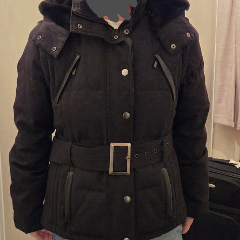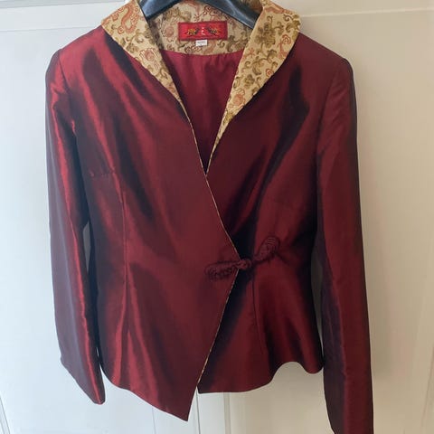 Riccovero jakke for dame i størrelse 36. Jakken er svart og laget i acetat med bomull linning. Den har belte i livet, slag på kragen og rødt fôr. Passer som penjakke eller blazer til hverdags og jobb.