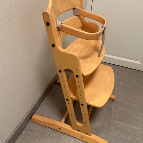 Stokke høy barnestol i hvit plast og lyst tre. Stolen har buet ryggstøtte og integrert sete i plast, samt fotbrett som kan justeres i høyde. Egnet som barnestol ved spisebord eller annet bord der barnet trenger å komme høyere opp. Designet gir støtte til rygg og føtter, og stolen står på fire ben i tre for stabilitet. Hentes på Buøy. Sendes ikke.