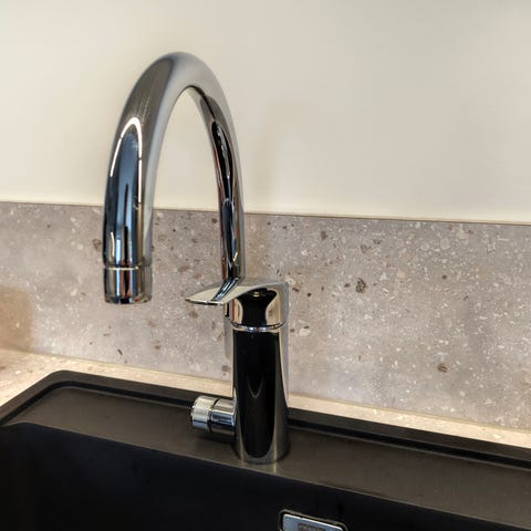 Kranen har høy, buet tut som gir god plass i vasken, og ettgreps hendel for regulering av vannmengde og temperatur. Overflaten er i blank kromfinish.
