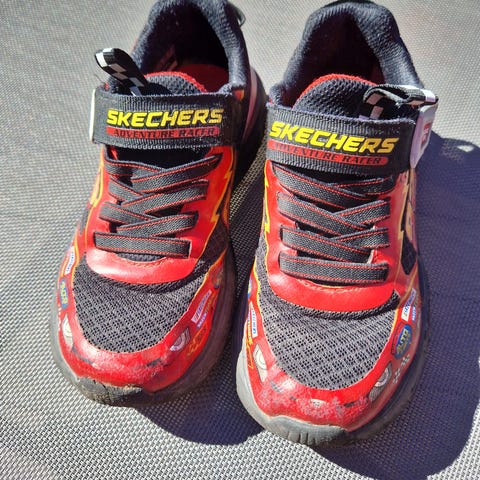 Sketcher skoene er i str 31 og kan slå på blinking. Det er en knapp på siden av skoene som kan slå av og på . Det blinker når man går - disse går for 300