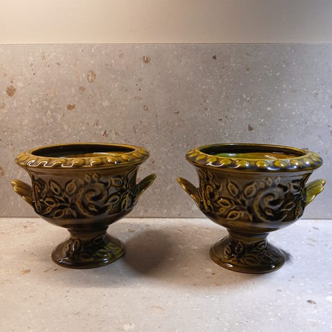 Tysk keramikk blomsterpotte i blå og brun glasur. Potter har relieffdekor med blomster/plantemotiv på utsiden og bølget struktur i godset. Innsiden er helglasert i dyp blå farge. Bunnen er merket med «Germany» og nummeret 771 12. Egner seg som innerpotte eller dekorativ krukke til mindre planter eller oppbevaring. Høyde: 11.5 cm og 13.5 cm i diameter.