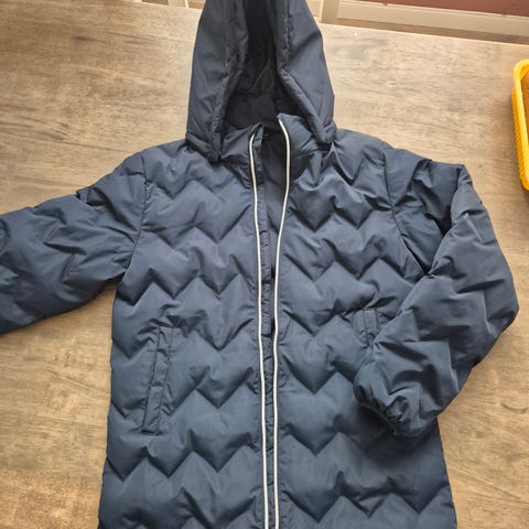 Jakken er i god stand, men med noe slitasje rundt armene.