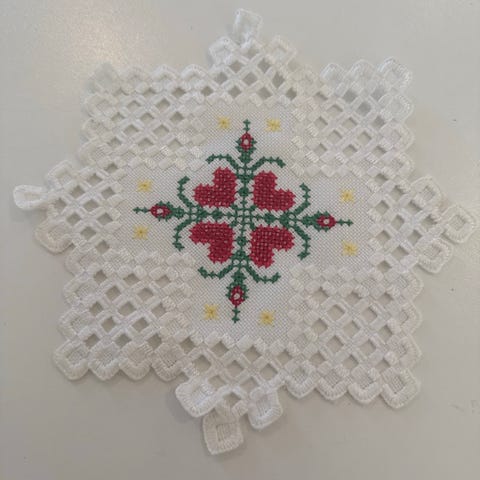 Duk med flerfargede striper. Duken har lys bunnfarge med dekorative horisontale striper i blant annet rødt, grønt, svart, hvitt og oransje. Mønsteret består av gjentakende bånd og små geometriske detaljer.