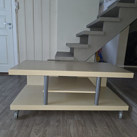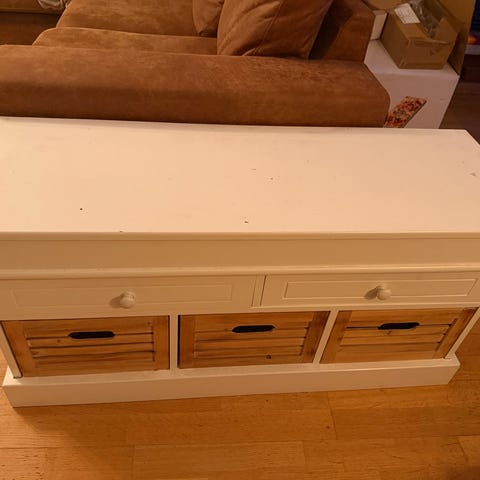 Tv benk gis bort mot henting, hjula på den er ødelagt. Men går ann å bytte hjul eller bruke uten hvis man ønsker. 3 skuffer i.