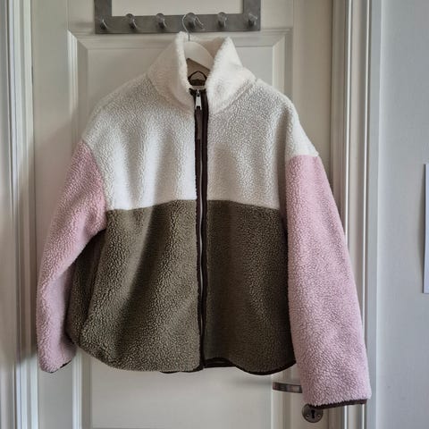 Gina Tricot tykkere fleecegenser for dame i størrelse M. Genseren er flerfarget med lys hovedfarge, kontrastfelt på skuldre og ermer samt detalj på magen. Den har høy hals og halv glidelås i front. Materialet er myk fleece som gir behagelig varme. Passer til hverdagsbruk og som et ekstra lag på kjølige dager. Stor lomme. Kortere modell.