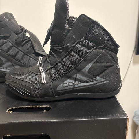 Ubrukt Course motorsykkelsko i høy modell i størrelse 46. Skoene er svarte med lisser og borrelåsstropp øverst for ekstra stabilitet rundt ankelen. Forsterkninger ved tå- og hælparti gir bedre beskyttelse ved kjøring. Sålen er laget for godt grep mot fothvilere og underlag. Egnet som kjøresko til motorsykkel og scooter i hverdagsbruk og kortere turer.
