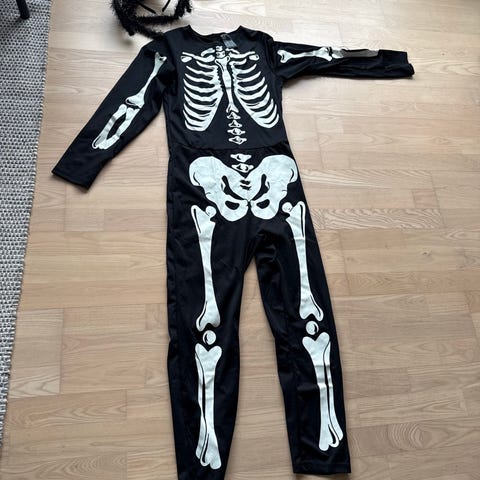 Skjelett kostyme for jente i størrelse 128. Kostymet består av en svart overdel med rosa skjelettmotiv og gjennomsiktige ermer, samt rosa tyllskjørt. I tillegg følger det med svarte bukser med rosa beindetaljer. Materialet er syntetisk stoff med tyll i skjørtet. Egnet som utkledning, Halloween eller karnevalskostyme.