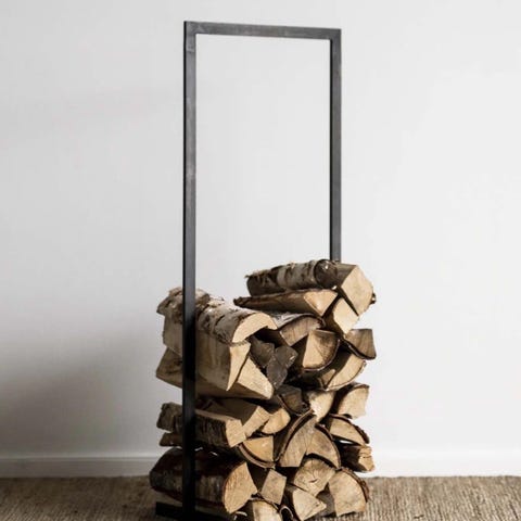 Vedstativ i glass. Stativet har to sideplater i klart glass og metallstang øverst for stabilitet og håndtering. Egnet til oppbevaring av ved ved siden av peis eller ovn innendørs. Designet gir god oversikt over veden og tar liten plass på gulvet.