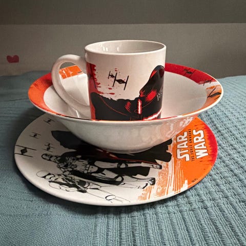 &Tradition Star Wars Dark Side tallerkensett med motiv av figurer og elementer fra Star Wars-universet. Tallerknene er runde og i lys farge med trykk av blant annet Death Star, Darth Vader, stormtrooper og romskip. Egnet til servering av for eksempel kaker, snacks eller mindre måltider. Passer til bruk på kjøkken eller som temaporselen ved filmkvelder og lignende.