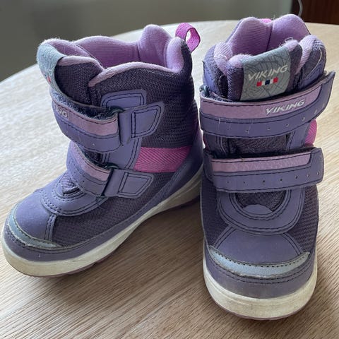 Viking vintersko i størrelse 23 for unisex. Skoene har høy modell med to borrelåsstropper for enkel av- og påkledning. Farge lilla med lys såle og lys polstring rundt ankelen. Yttermateriale i tekstil og syntetisk materiale, med polstret innside for økt komfort. Egnet som hverdagssko i kjøligere vær for barn som trenger stabile og varme sko.