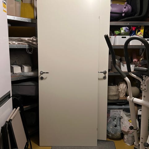 Innerdør i hvit utførelse med metall dørhåndtak og låskasse. Døren har standard dørvrider på begge sider og nøkkelskilt. Egnet som innvendig dør i bolig, for eksempel til soverom, bod eller andre rom innendørs. Litt merker så bør males.