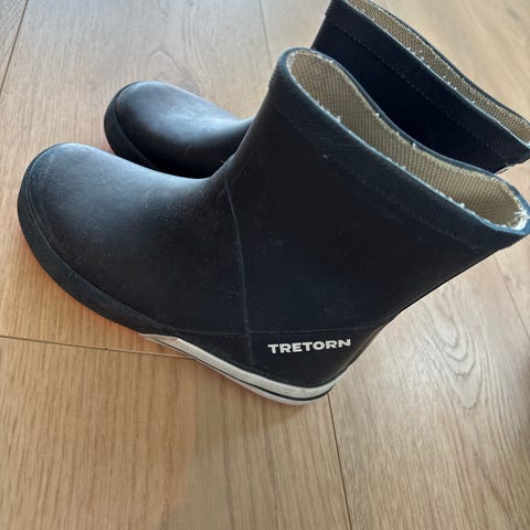 Tretorn gummistøvler for barn i størrelse 31. Unisex-modell i svart med oransje såle og kant øverst i kontrastfarge.