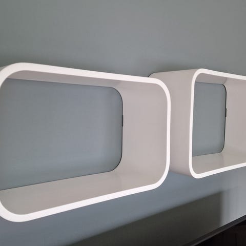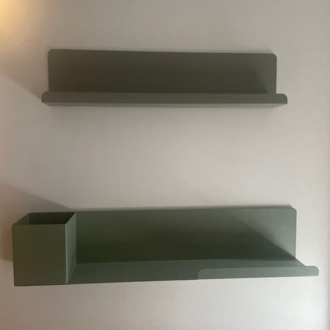 Selger fire ovale hyller fra Sebra. Dansk design kjent for kvalitet. Stødige, kule hyller som kan plasseres på mange måter - henges på veggen eller stables på gulvet.
