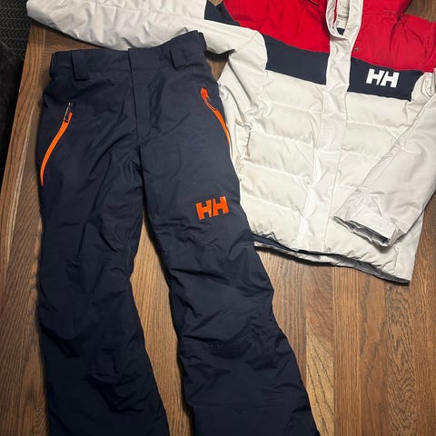 Helly Hansen skidress for gutt i størrelse 164. Sett med jakke og bukse i blå polyester med kontrastfelt og hette på jakken. Jakken har glidelåslukking foran og sidelommer med glidelås. Buksen har rette ben, forsterkede felt nederst og lomme på siden. Passer til utebruk og vinteraktiviteter. Nederkant på bukseben viser tydelig slitasje, se bilder for detaljert tilstand.