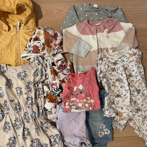 5 gensere (1 i ull) , 4 bodyer (2 i ull), 3 bukser og en pysj.