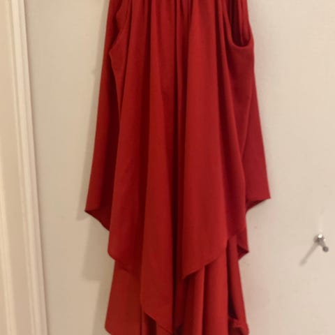Denne har ikke tilhørt meg, men at det er en helt spesiell kjole er sikkert. Mange lag med chifon stoff som ligger i forskjellige tungeformede lag i kjolen. Den er helforet med hvitt silke lignende stoff. Skulderstropper med «blomster dekor» i samme stoff som kjolen. Passer str M/L mener jeg. Kan sende