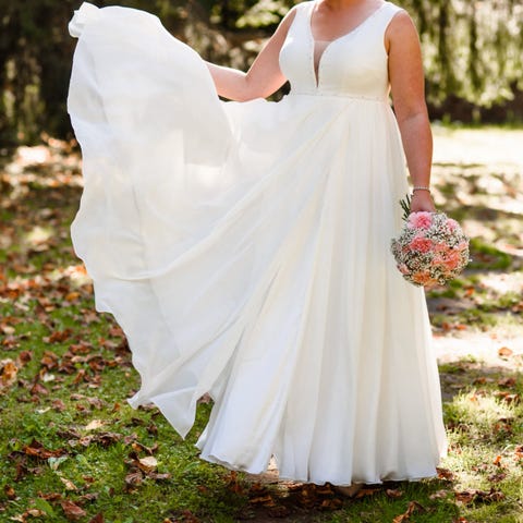 Selger en flott lang hvit kjole i størrelse 36. Kjolen har et enkelt og elegant uttrykk med broderte/blonde-applikasjoner over bryst og liv, og A-linje som faller pent og gir fin bevegelse i skjørtet. Lukkes med glidelås bak.