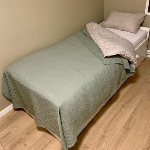 IKEA sengeteppe i grågrønn farge (mest grå). Ikke tatt i bruk. Egner seg godt som sengeteppe til dobbeltseng.